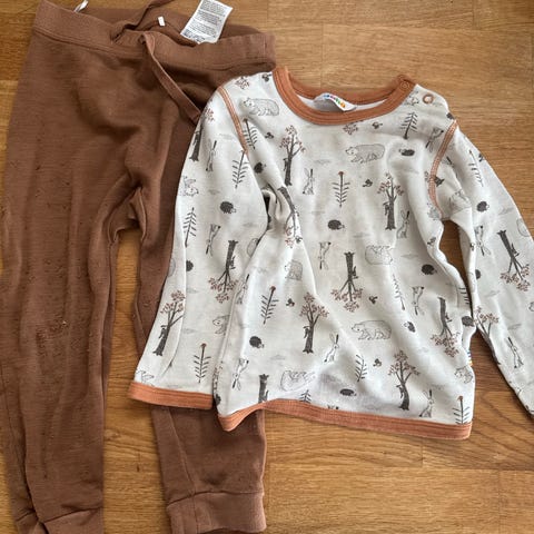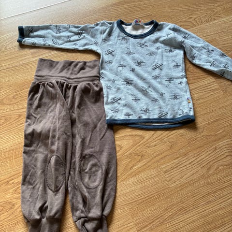Lindex ullsett. Bukser 86/92 men mer 92 og genser 2-4 år, men passer fint for 1 åringen. Etter 1 barn. Ingen hull. Tykk.