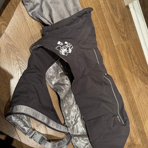 Dekkenet er størrelse 40 (cm). Dekkenet har varmreflekterende stoff på innsiden og refleks på utsiden. Stroppene til å feste mellom beina er fortsatt inntakt. Det er brukt i inntil -20 grader. Min hund vært fornøyd hele tiden!