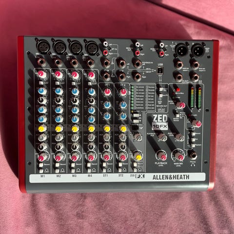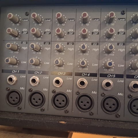 Kompakt mikser. Fin til hjemmestudio og små live oppdrag. 2 mic innganger med XLR. Hver kanal har justerbar nivåkontroll. Effektprosessor med delay-reverb. 2 linje innganger og 2 stereo linje innganger. Hovedutgang og hodetelefonutgang.