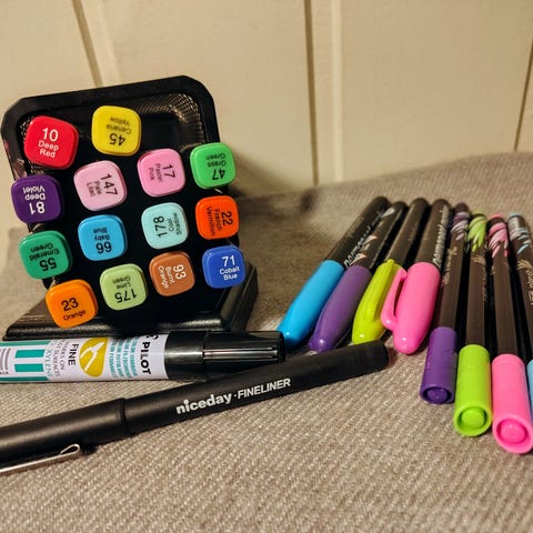 1 enhjørningsblyant, 4 merketusjer fra Midliner, 3 fra Highlighter, og 6 tusjer fra Pilot Pintor (metalliske farger) selges råbillig og samlet.