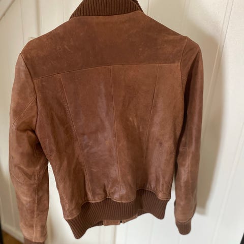 Oversized skinnjakke i brun farge, størrelse S fra BikBok. Jakken har glidelås foran, belte-detaljer nederst i sidene og lommer med klaff.