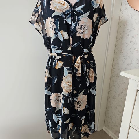 Blomstrete kjole, med søring i midjen, lommer og kul detalj på ryggen (se bilde 3)