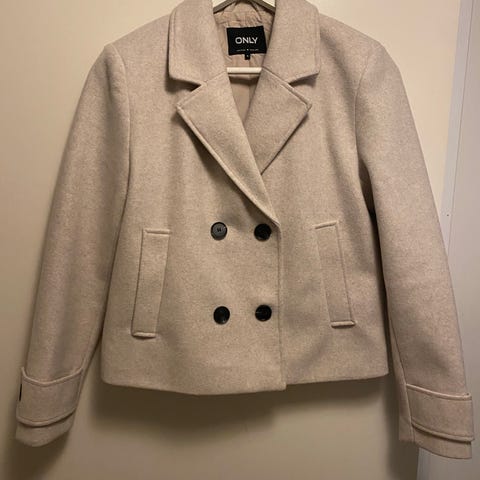 A Day's March Simplee kåpe i størrelse S med svart og hvitt hundetannmønster. Kåpen har dobbeltradet knappelukking og belte i midjen. Materialet fremstår som vevd stoff, egnet for kjøligere vær. Passer til kvinner.