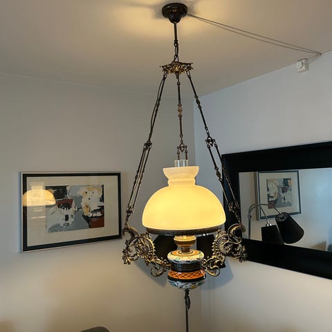 Pen og lite brukt smijernslampe for parafin. Kjøpt på Husfliden. Den har hengt på hytte. Kan ikke sendes, men må hentes i Arendal.