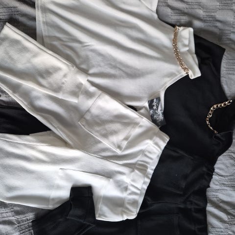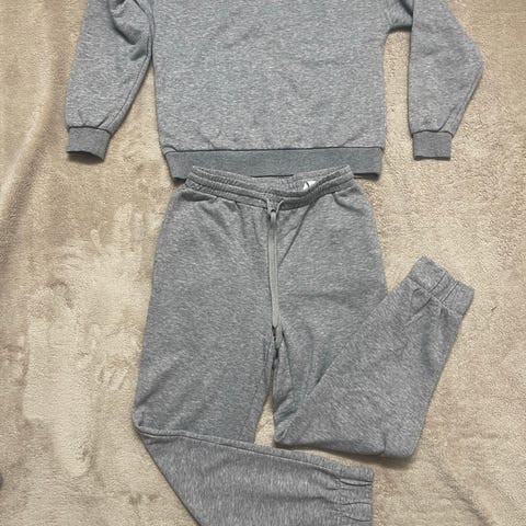 ASOS Grå joggedress for dame i størrelse M. Dressen består av en genser og bukse i grått stoff med elastisk midje på buksen. Begge plagg har en svart bokstav 'A' som dekorasjon. Passer for de som også bruker størrelse s. Kostet 750kr, men selges for 300kr. Brukt bare en gang