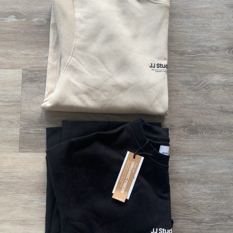 Klespakke med strikkegenser (gråmix), strikket piquet polo T-skjorte (beige) og linbukse i linmix (beige). Kun linbukse fra Jack & Jones som er brukt. Genserene er ubrukte med lapp. Størrelse large.