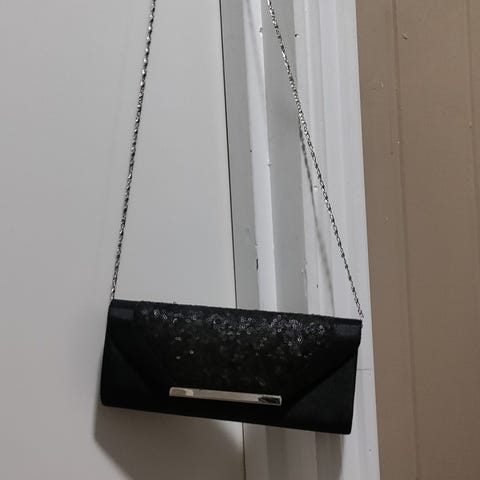 Pent brukt clutch fra Floyd. Svarte og blanke strassteiner på lokket. Tynn lenke som kan hektes av. Lengde ca 23.5 og høyde ca 9 cm. En liten skade på den ene svarte strassteinen på toppen av lokket og 4 små blanke strassteiner mangler på bunn av lokket (se bilder).