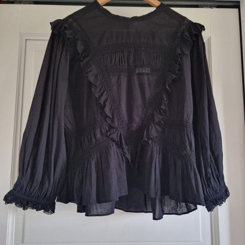 Pia Tjelta Janis bluse i hvit farge, størrelse XL. Blusen har lange ermer med elastiske mansjetter og en løs passform. Materialet er lett og teksturert med detaljer som broderte mønstre ved skuldrene og knyting ved halsen. Bohemsk stil.