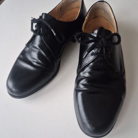 Pent brukte sko med minimal hæl. Knyting. Svart skinn. Størrelse 36.
