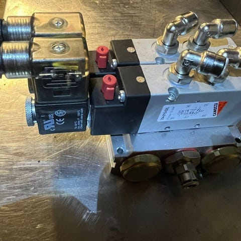 Camozzi C1202-AV/P1 pneumatisk ventil med tilhørende trykkregulator og filter. Ventilen er også utstyrt med smøreapparat (tåkesmøring). Dette for å drive forebyggende vedlikehold på utstyret som er tilkoblet, om det er en hel maskinlinje, eller bare verktøy. Trykkregulatoren inkluderer et manometer for trykkavlesning. Smøredelen er utstyrt med en gjennomsiktig beholder for avlesning av gjenværende oljenivå. Denne enheten brukes i pneumatiske systemer for å kontrollere luftstrøm og trykk.