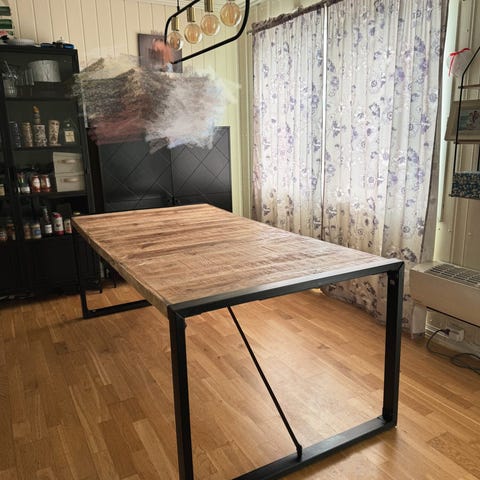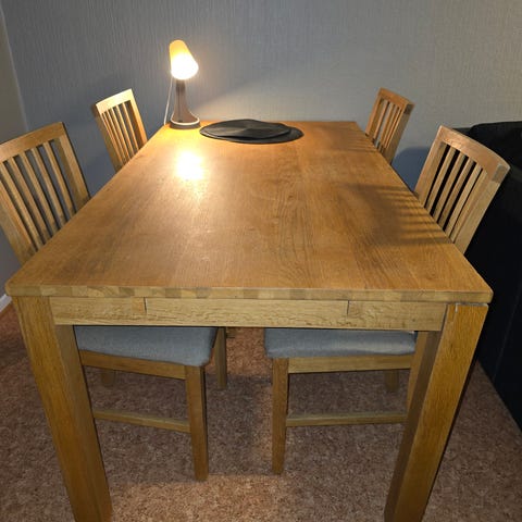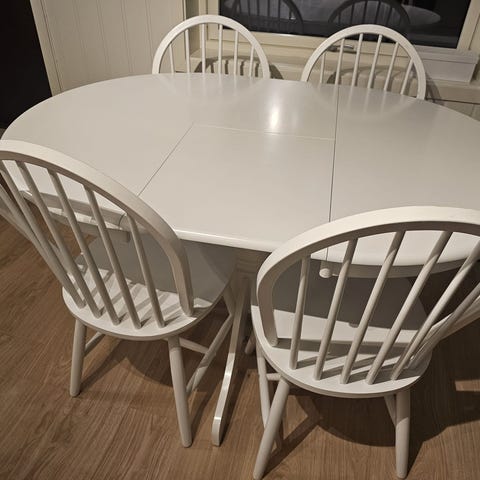 Spisebord med ileggsplater, kommer med 4 ekstra stoler. Det er en høydeforskjell og liten forskjell i farge på de ekstra stolene.