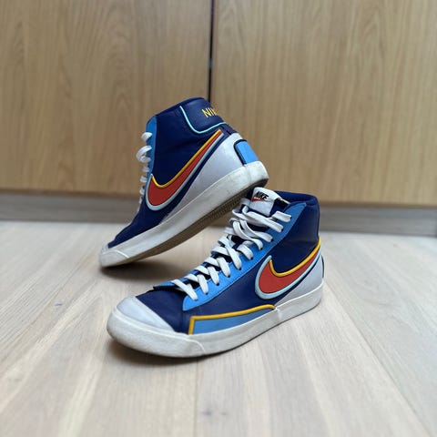 Nike Blazer Low ‘77 SE, str 40. Hvite, med blå og turkis logo. Brukt pent to ganger.