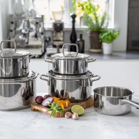 Berghaus grytesett bestående av 12 deler i rustfritt stål med glasslokk. Settet inkluderer flere gryter og en stekepanne, egnet for ulike matlagingsbehov. Designet for bruk på alle typer komfyrer, inkludert induksjon.