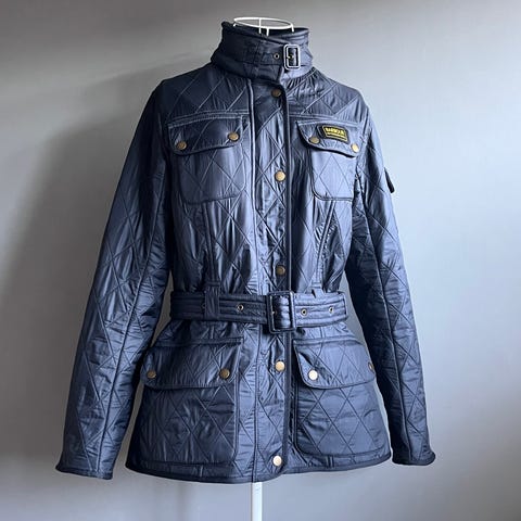 Barbour International i brun farge, størrelse M (38/12) dame. Jakken har belte i livet, flere lommer med knapper og glidelås, samt klassisk Barbour-logo på brystet. Materialet er slitesterkt og egnet for utendørs bruk. Jakken er vokset fra fabrikk. Brun fløyelskrage. Pent rutet for. Kjøpt i London. Lite brukt. Ingen skade. Kan sende.