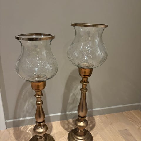 2 svært pene lysestaker for kubbelys. Sølvfarget, dekorativ og stødig. Den største er 46 cm høy, og den minste 40 cm høy. Selges samlet for 200kr. Må hentes.