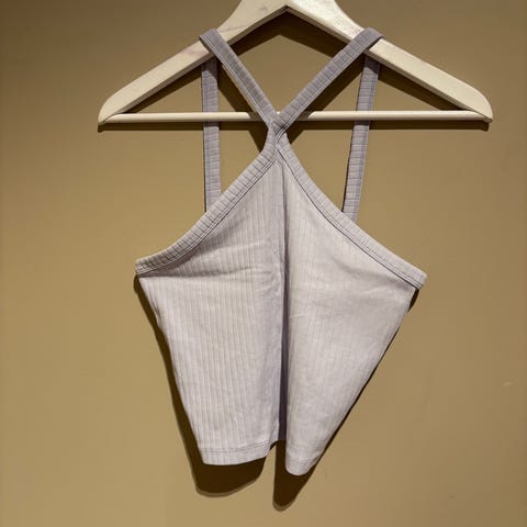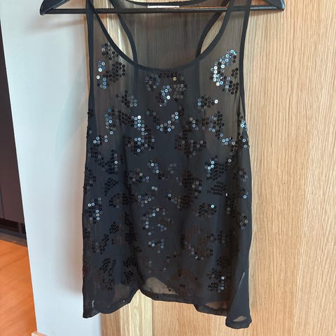 Gina Tricot Tanktopp i størrelse M for kvinner. Toppen er beige og dekorert med paljetter. Den har racerback-design. Toppen viser noen flekker på innsiden.