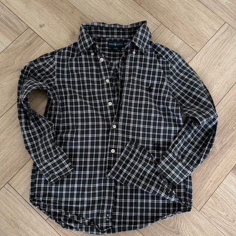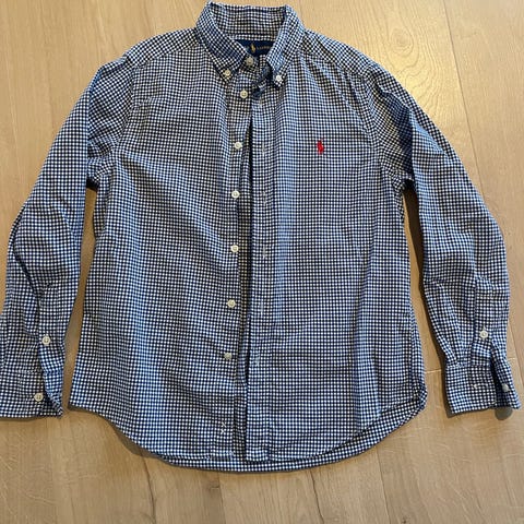 Ralph Lauren skjorte for gutt i størrelse 128. Skjorten har blå og hvit rutemønster og er laget av bomull. Den har knappelukking foran og brodert logo på brystet.