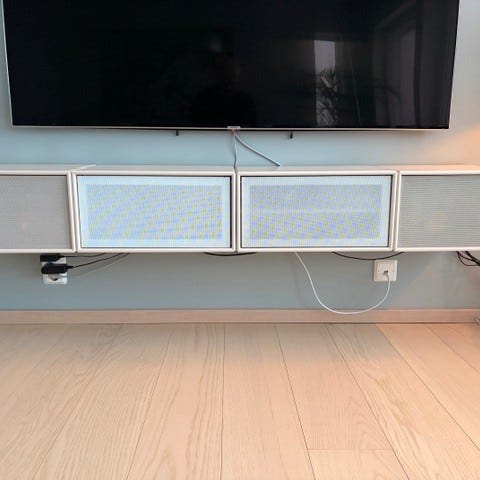 Kan stables, stå ved siden av hverandre og danne medie-benk, eller brukes separat.