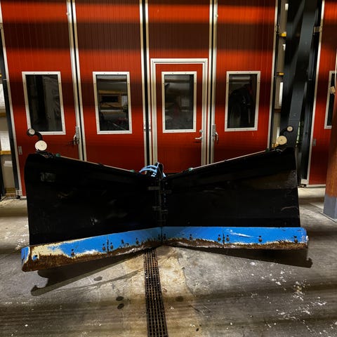 Frontskjær/hydraulisk v/-plog til salgs. Passer til fronthydraulikk til traktor og hjullaster. Kraftig og solid.