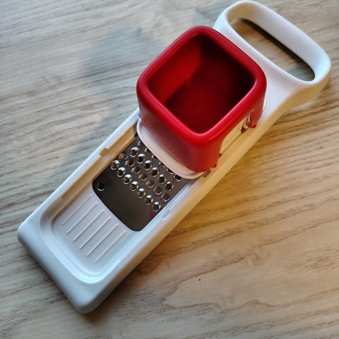 Tupperware rivjern laget av plast i rød farge. Inkluderer flere deler for rivning og oppsamling av matvarer. Egnet for kjøkkenbruk.