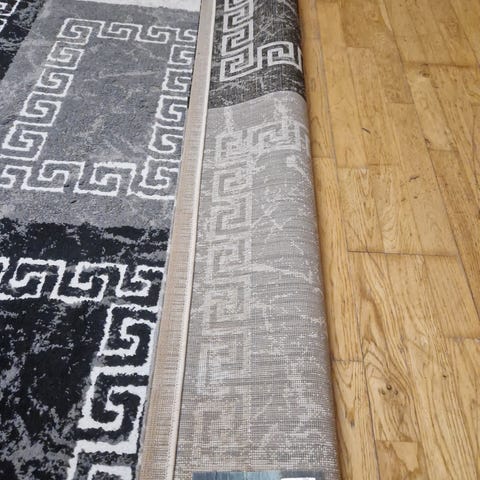 Selger et moderne og stilrent teppe i sort, grå og hvite nyanser. Teppet gir et lunt og elegant uttrykk, og passer perfekt til både lyse og mørke møbler.