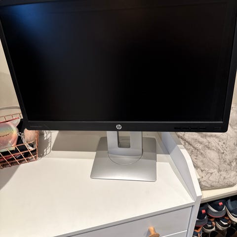 HP EliteDisplay E232 Monitor med 23 tommers skjerm. Skjermen har svart front og sølvfarget stativ. Designet for bruk som dataskjerm med standard tilkoblinger. Passer for kontor- og hjemmebruk.