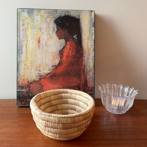 Brukt på hytta til tepper, stått i et hjørne, fin kurv