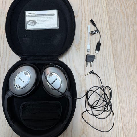 Bose QC True Wireless Earbuds i svart farge med ladeetui. Trådløse ørepropper med innebygd mikrofon og kontrollknapper. Designet for komfortabel passform og god lydkvalitet. Egnet for bruk under trening, pendling og daglig bruk.
