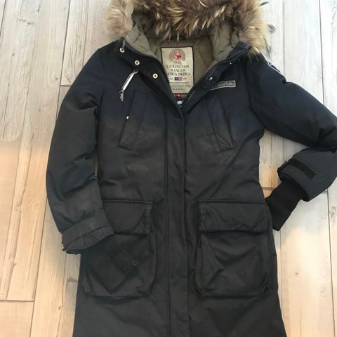 Lexington vinterjakke for kvinner i størrelse S. Jakken er brun med quiltet innsiden og har hette med pelskant. Den har flere lommer foran og glidelås med knappestolpe i front. Kun brukt et par ganger. Kjøpt ny for 6000kr