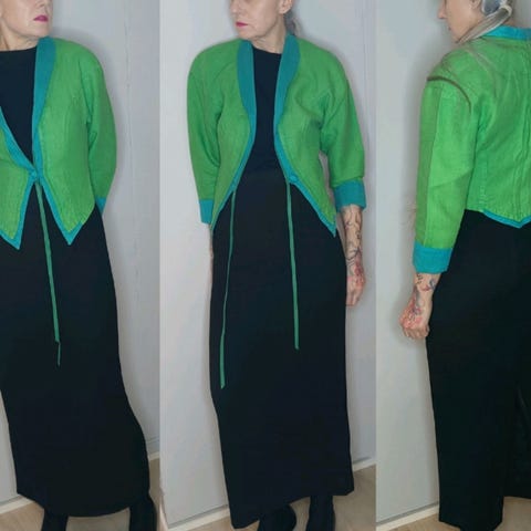 Nydelig jakke i svart silke med rosa og hvite silkedetaljer fra Kirsten Krog design. Puffermer og elegante ermer med oppbrett i rosa silke. Pent brukt. Kan hentes i Oslo eller sendes. Kjøper betaler porto.