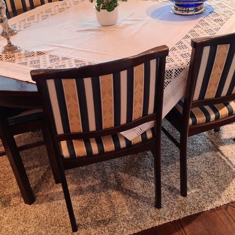 Tilstand: trekkene er i god stand. Skumgummien på setene er morkent men i ryggen er de bra. ( Enkel jobb å skifte innmat . Stolene er relativt enkle å trekke om dersom farven Ikke faller i smak.