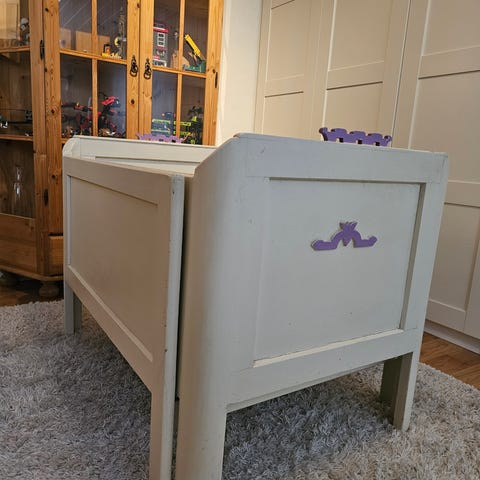 Uttrekkbar barneseng fra 50-tallet. Er pusset og malt for en del år siden, men trenge et nytt strøk maling. Ellers hel og fin.