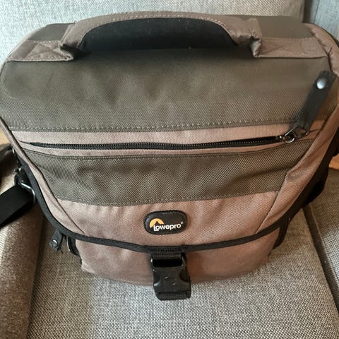 pent brukt kamerabag, plass til kamera og ekstra objektiv/utstyr
