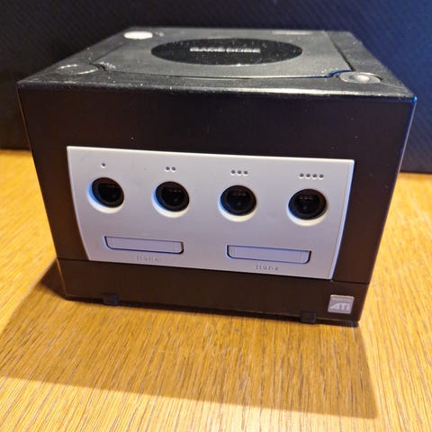 Nintendo GameCube spillkonsoll i svart farge. Konsollen har fire kontrollerporter og en diskstasjon for spill. Passer til bruk med kompatible GameCube-spill og tilbehør.