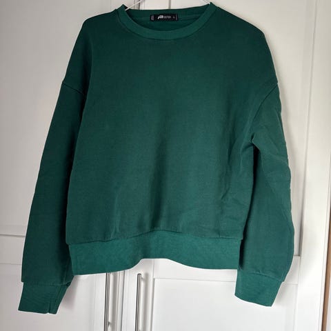 Ny med tags / muligens brukt en gang siden det er et par flekker på den, No Fear cropped genser / crewneck / collegegenser, i hvit / krem farge og grønne bokstaver. Størrelse medium. Kjøpt på H&M Divided