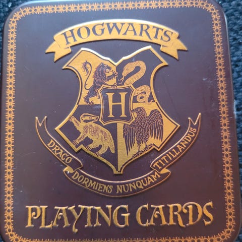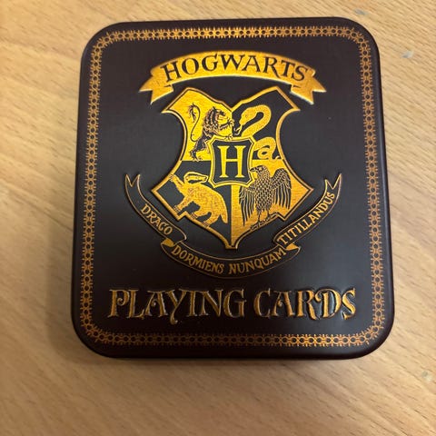 Harry Potter Spillkort Sett inneholder to kortstokker med unikt design inspirert av Harry Potter-universet. Kortene har detaljerte illustrasjoner av karakterer og symboler fra serien, med en fargepalett i grønt og gull for esken, og svart-hvitt for kortene. Passer for samlere og til bruk i kortspill.