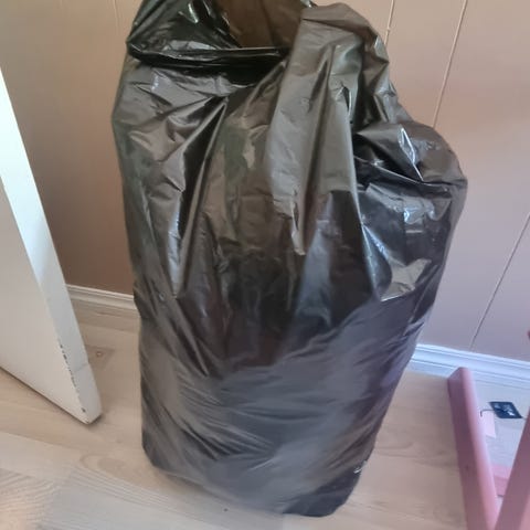 Full søppelsekk med masse klær (vintertøy, regnsett, hverdagsklær osv)