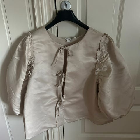 byTiMo pen jakker i beige farge, størrelse Large for kvinner som er lite brukt (toppen 5 ganger). Jakken har en unik design med quiltede detaljer foran og dekorative broderier. Materialet kombinerer ulike teksturer, og jakken har en løs, feminin passform med en lett volang nederst. Egnet for bruk som ytterplagg i mildere værforhold, og ble ikke brukt lite mye som forventet. Så bedre at andre kan bruke den og få glede av jakken
