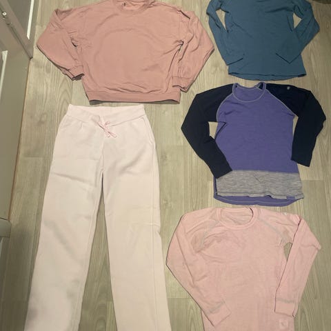 Selger ei klespakke med ull, fleecejakke og slengbukse.