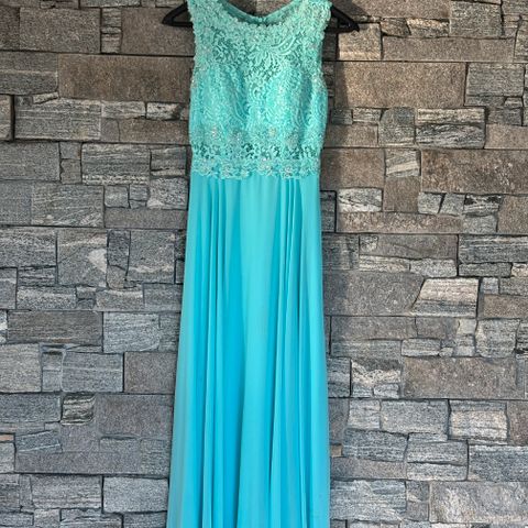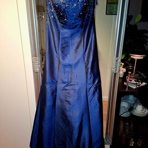 Klassisk og tidløs kjole til spesielle anledninger. Den har maxi pluss lengde slik at kjolen dekker sko. Jeg er 165 cm høy, den gikk ned til gulvet med høyhæler på 9 cm. Kjolen har en avtagbar belte i lyse blå farge. Ryggen ser ut som knapper, men det en skjult glidelås, lett å komme inn og ut. Kjolen kommer med avtagbare bh stropper og skjerf. Den har også innsydd korset som gjør at kjolen sitter veldig pen på. Brukte den 2-3 ganger. Kjolen er ikke renset (se siste bildet), eller ingen merker på utsiden. 👌🏻