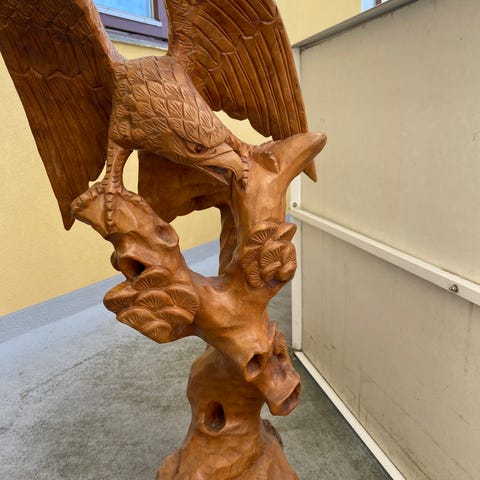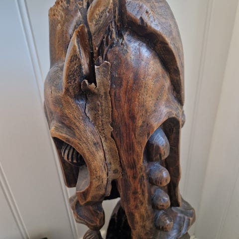 Håndlaget tre skulptur laget av naturlig treverk med uregelmessige former og knuter. Skulpturen har en naturlig brun farge og står på en solid base og er ca 125 cm. Skulpturen er håndbearbeidet, lakkert og signert av kunstneren.