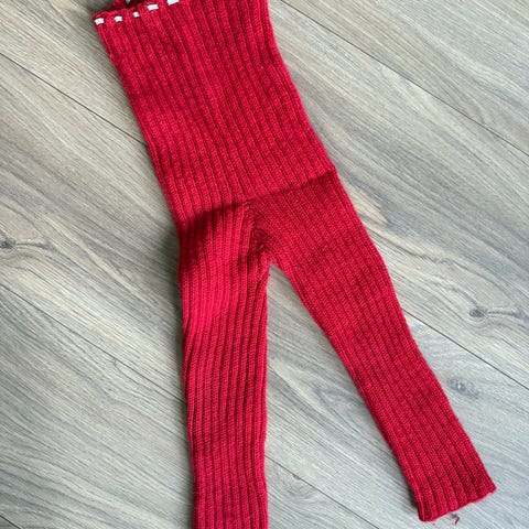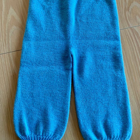 Litt usikker på str da jeg ikke har så små barn lenger, men den strikkede buksen er 56 cm lang, og de skal være i lik str (muligens 92/ 98)