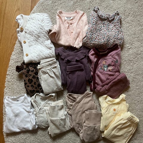 Jeg selger babyklær i størrelse 50–56, samt en vest i størrelse 68 (prisene står på bildene).