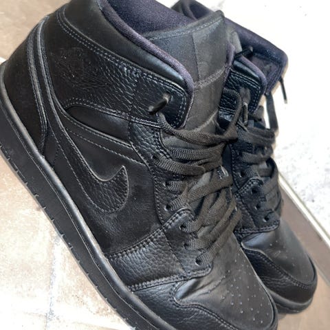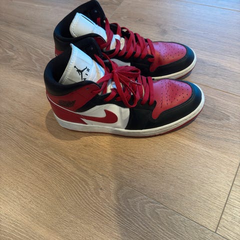Nike Air Jordan 1 Mid sneakers i størrelse 43. Skoene har en fargekombinasjon av rød og svart, med en hvit såle. Materialet er hovedsakelig lær. Modellen er designet som joggesko/sneakers. Brukt, men hel og fin, masse bruk igjen.