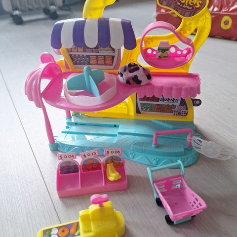 Slime-licious lekesett med flere rom for oppbevaring og tilbehør for å lage slim. Lekesettet inkluderer en dispenser for pulver og væske, samt en arbeidsflate for å blande ingredienser.