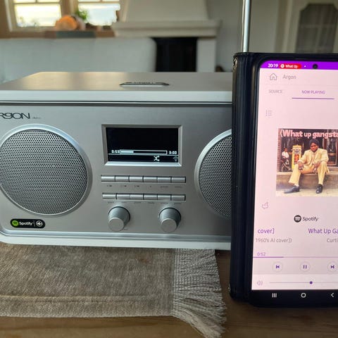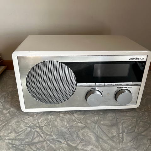 Flott pent brukt god lyd og er i god stand Argon iNet3++ er en radio med DAB, digital FM og Bluetooth-funksjonalitet. Den har et sølvfarget kabinett og to høyttalere. Radioen har en digital skjerm som viser kanalinformasjon og avspillingsstatus. Den har flere knapper for kanalvalg og volumkontroll, samt en hodetelefonutgang. Enheten er designet for bruk i hjemmet og gir tilgang til digitale radiokanaler og trådløs musikkavspilling.
