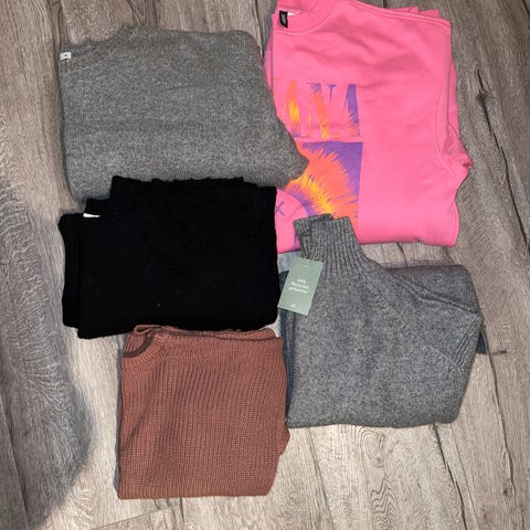 Dette er en klespakke som er bukser og genser. De er laget av en blanding av polyester, fleece og bomul. Buksene er brukt 2 ganger og begge er fra H.M . Resten er fra ulike merker. De er behagelige og myke . retur er ikke akseptert. Se på varet godt før du bestemme .