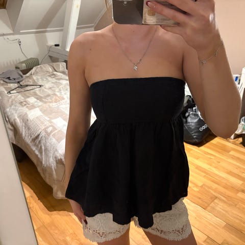 Bik Bok BT Zingo stroppløs topp i størrelse XS. Toppens farge er hvit og den har elastisk kant ved midjen og skuldrene. Materialet er lett og egnet for kvinner.