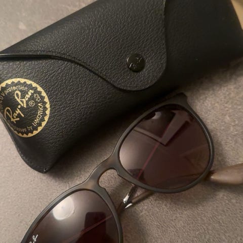 Ray Ban Erika, svarte! Er en ripe i ene glasset, og litt på innfatningen! Men det synes lite, og går ikke utover funksjonen til solbrillene 😄 mye solbrille igjen…