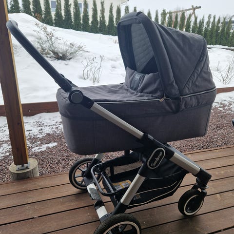 Praktisk vogn med låsbare hjul. Bag- og sportsdel kan monteres begge veier.
